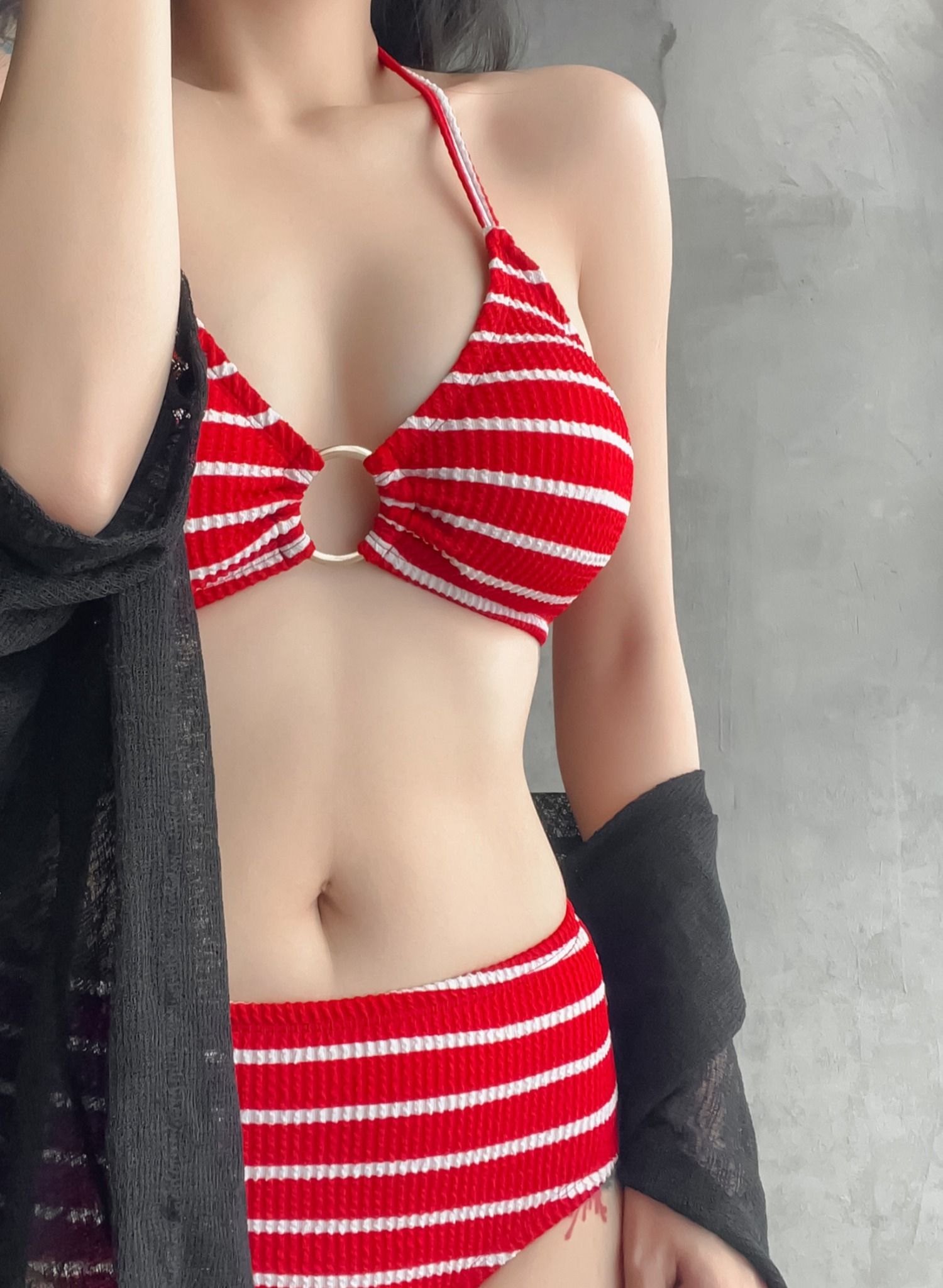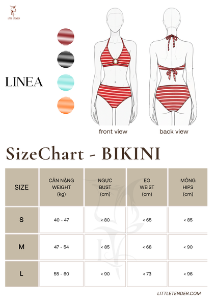 - Bikini: Sử dụng Chất thun gân bikini cao cấp nhập khẩu từ Hàn Quốc (được Little & Tender đặt dệt riêng). Bề mặt vải mềm mịn, co dãn vừa, dày dặn và đặc biệt có độ đanh giúp ôm sát cơ thể, tôn vinh đường cong một cách hoàn hảo.